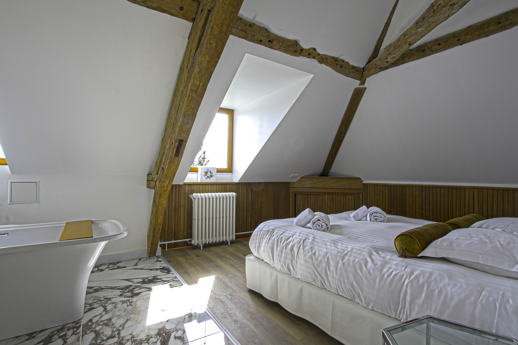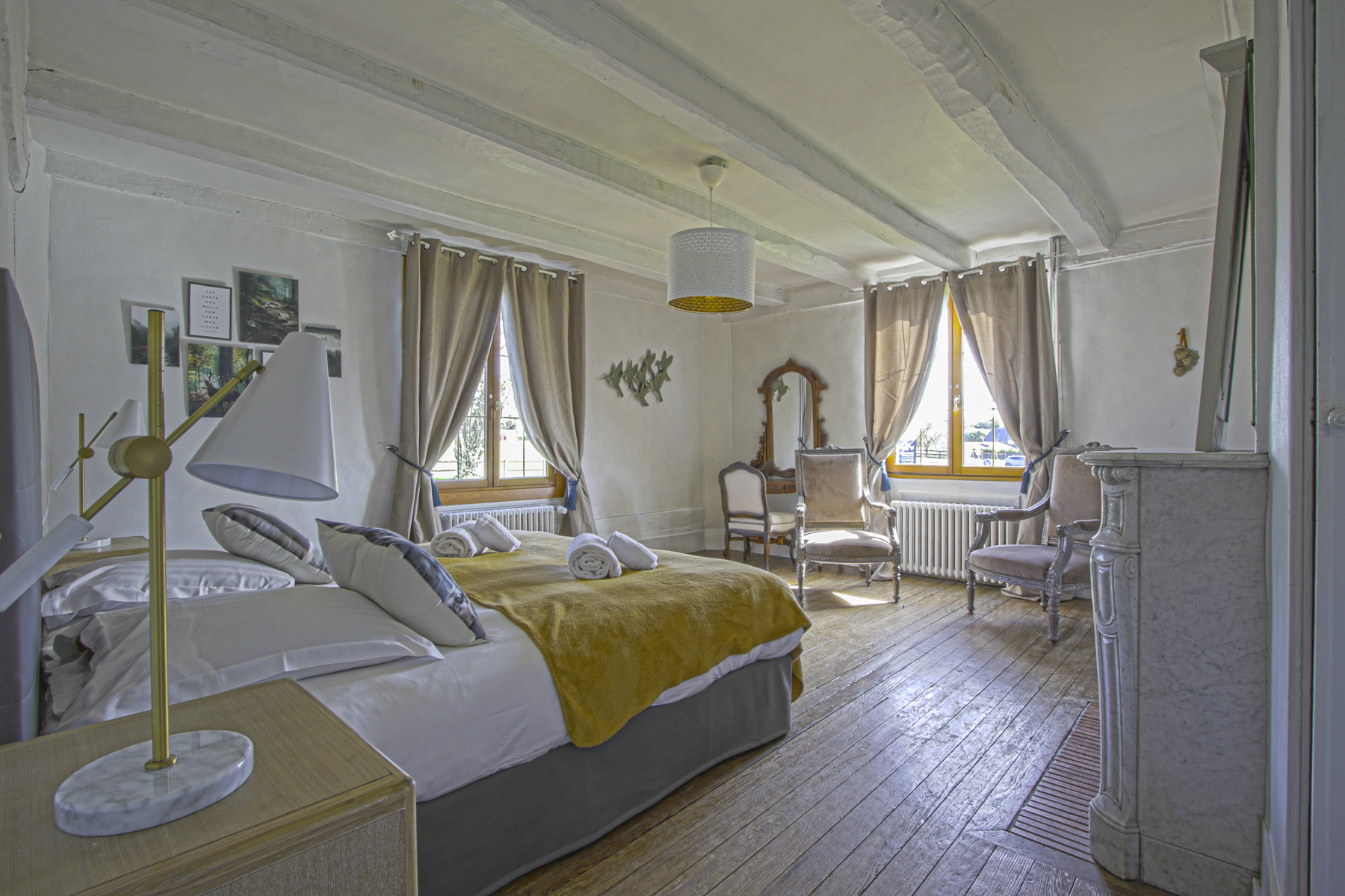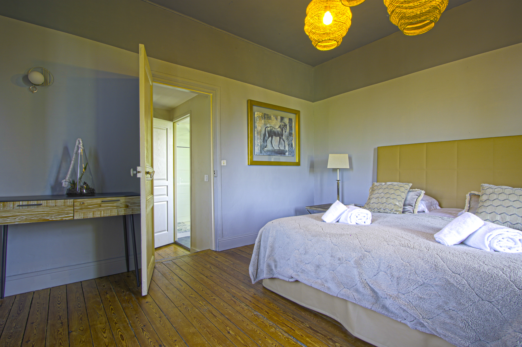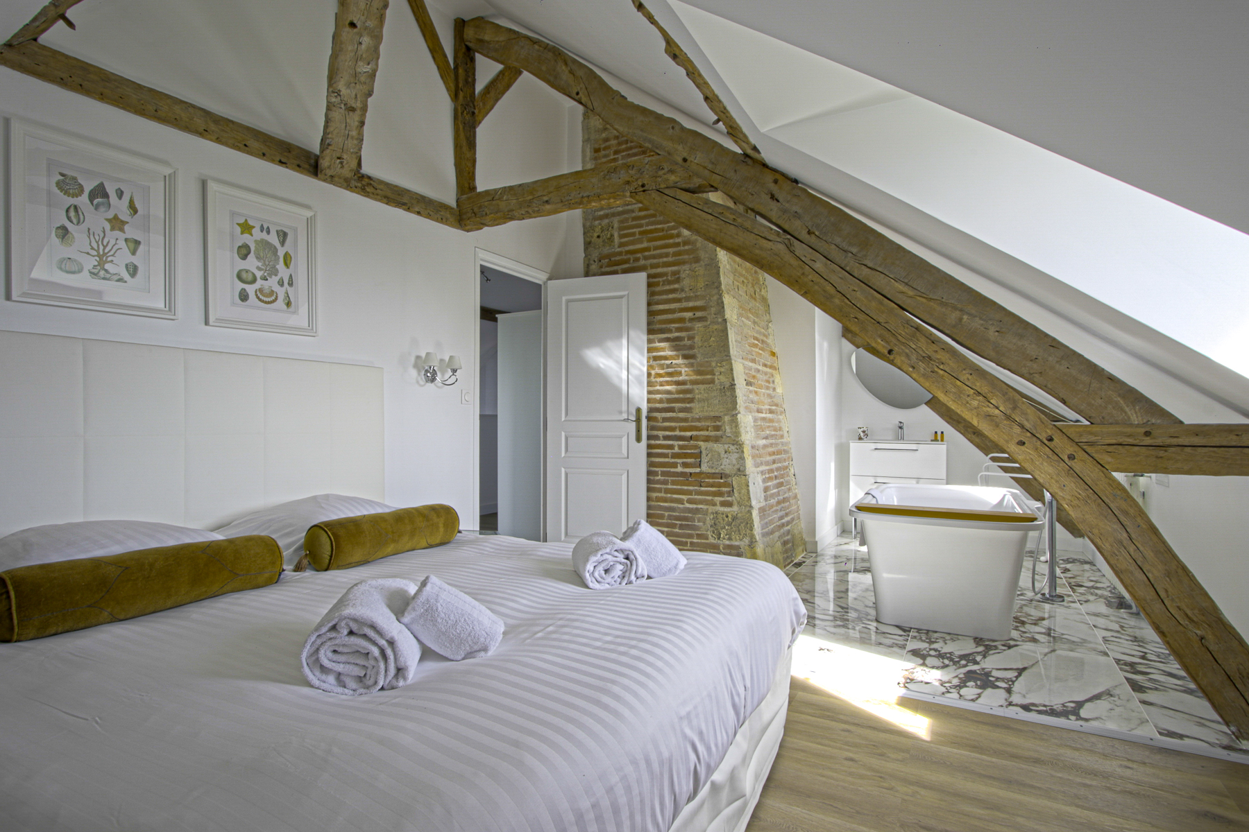 Deux grandes chambres avec lits 160 × 200, chacune disposant de sa salle de bain attenante (l’une avec douche, l’autre avec baignoire).