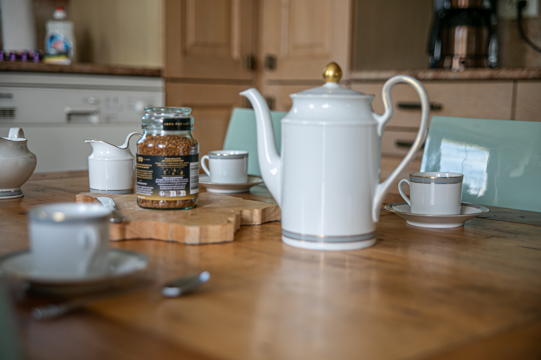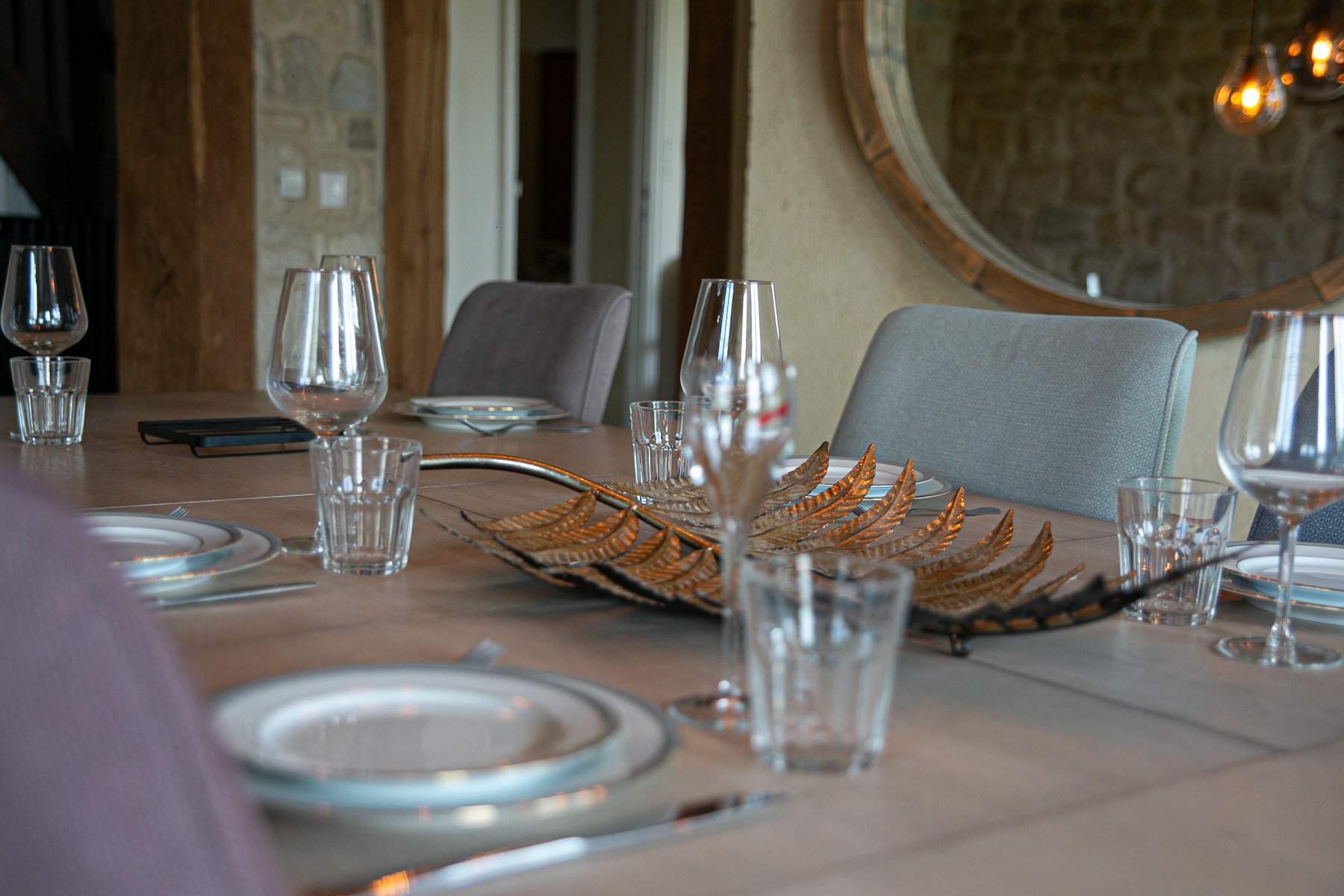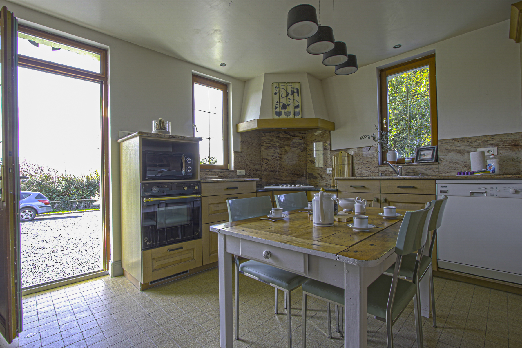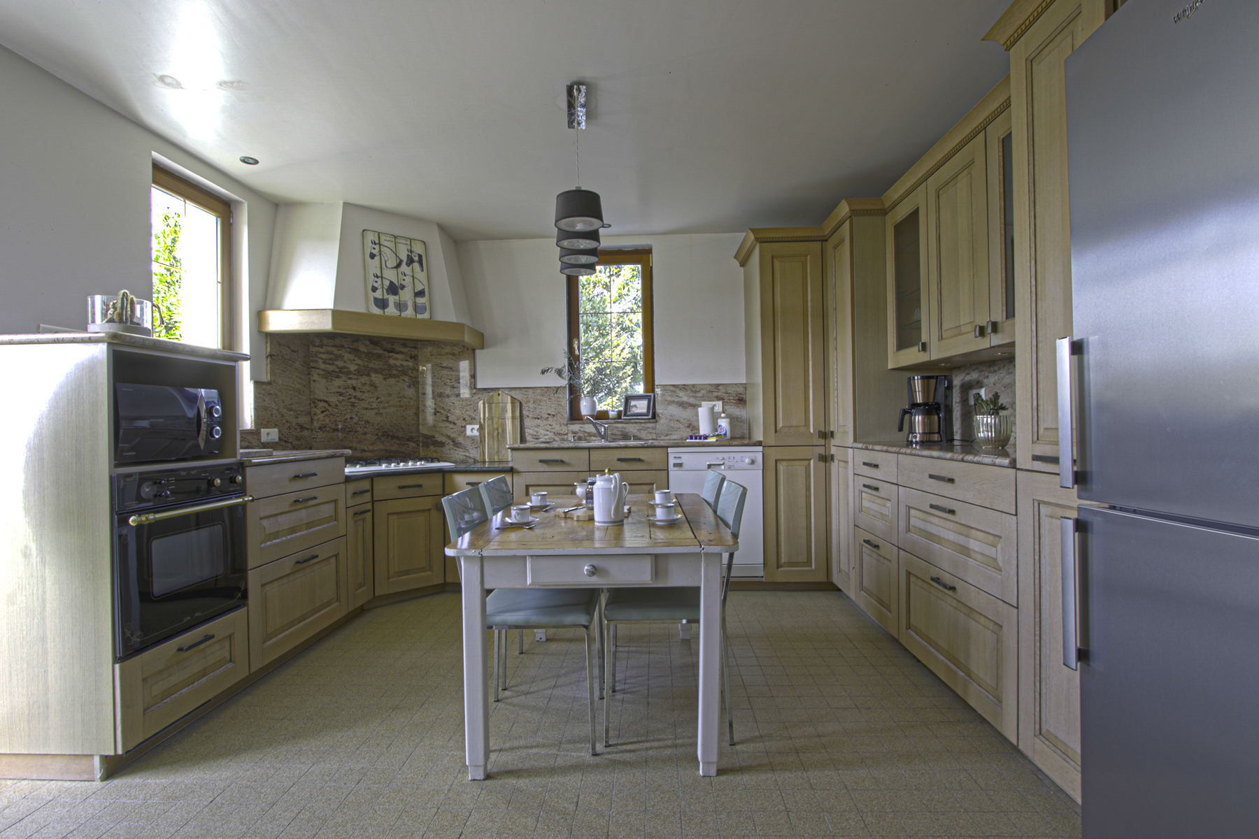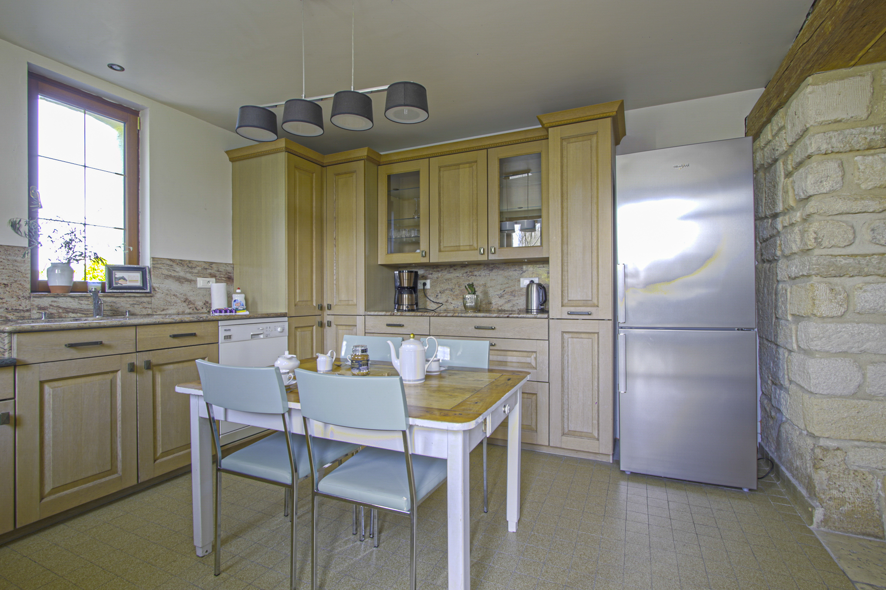 Cuisine ouverte entièrement équipée : réfrigérateur, congélateur, lave-vaisselle, four, micro-ondes, plaques gaz (5 feux), machine à café filtre, bouilloire. Une table est également prévue pour les petits-déjeuners des plus jeunes.