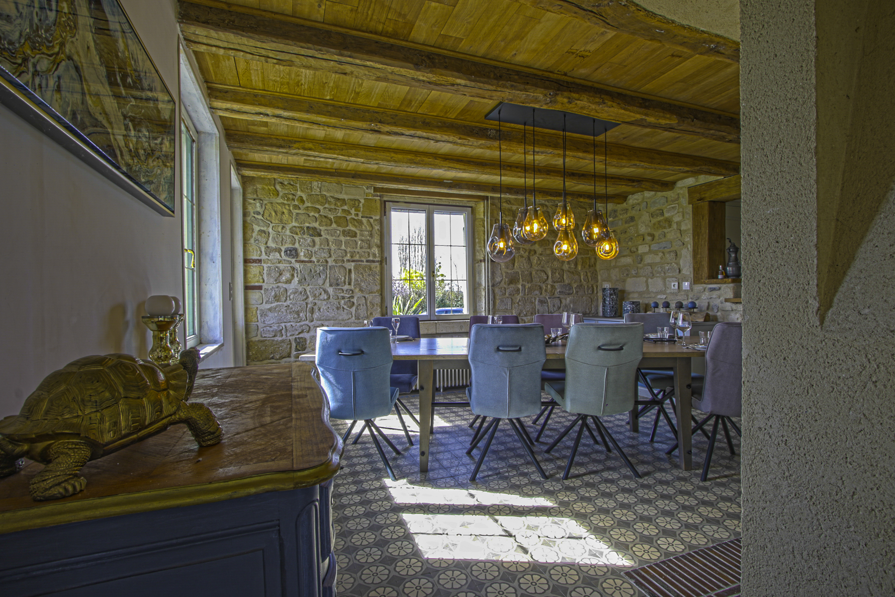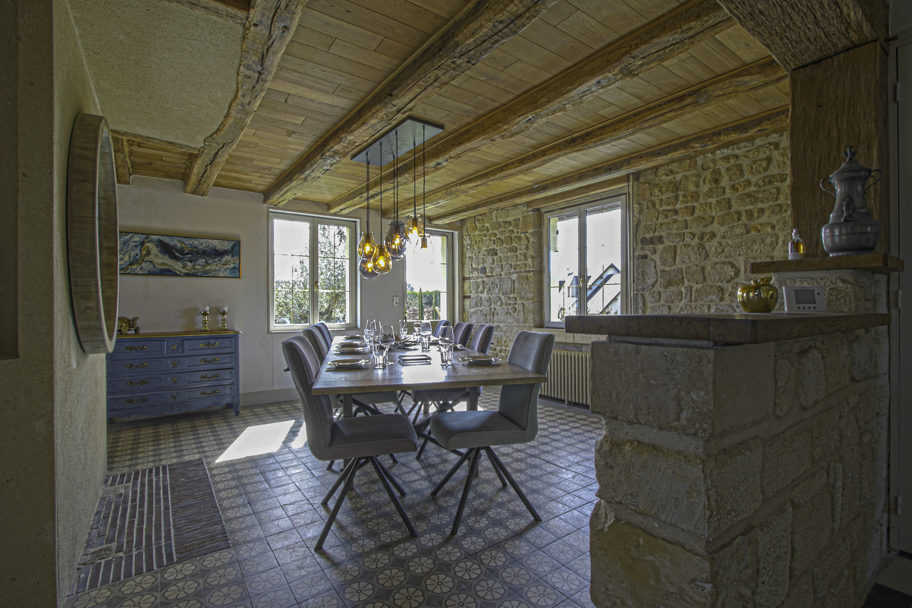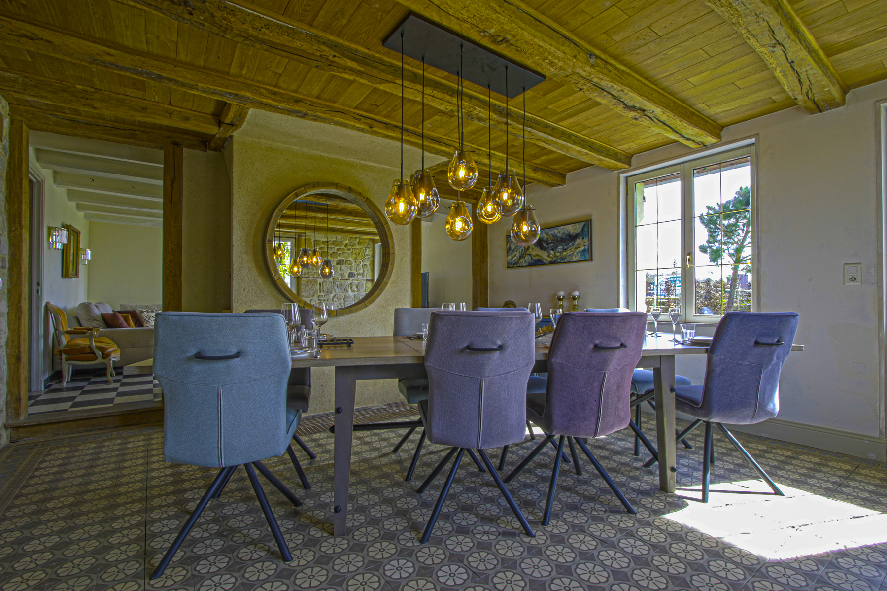 Salle à manger avec une grande table, idéale pour partager de longs repas conviviaux.