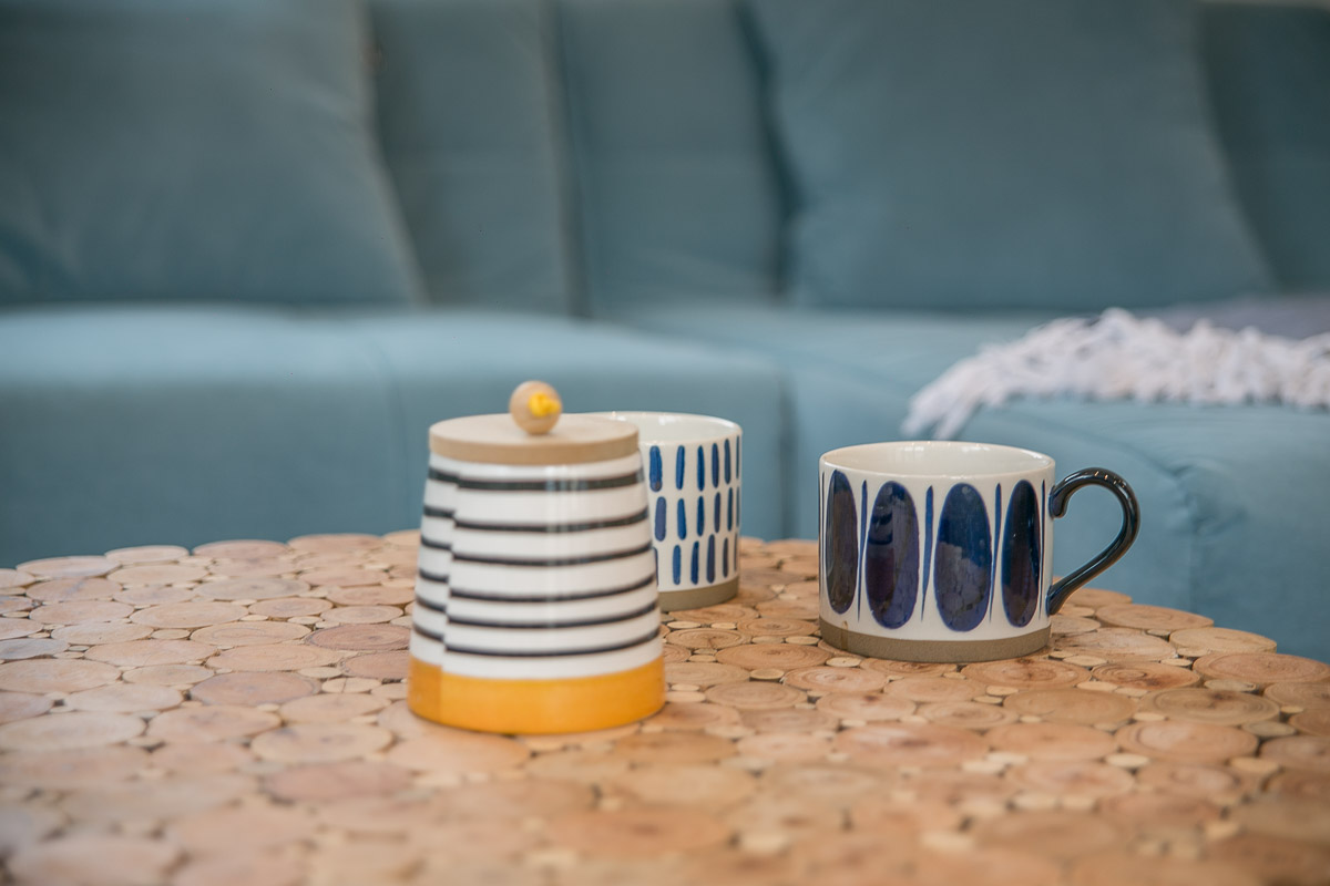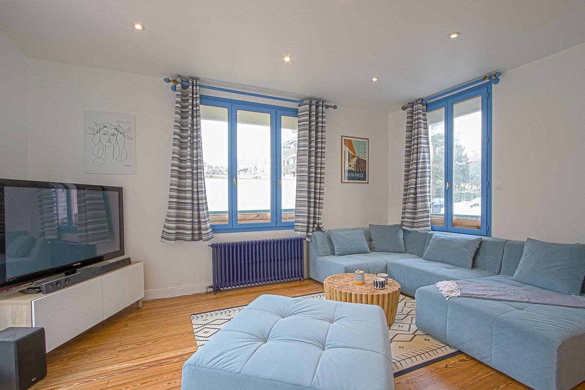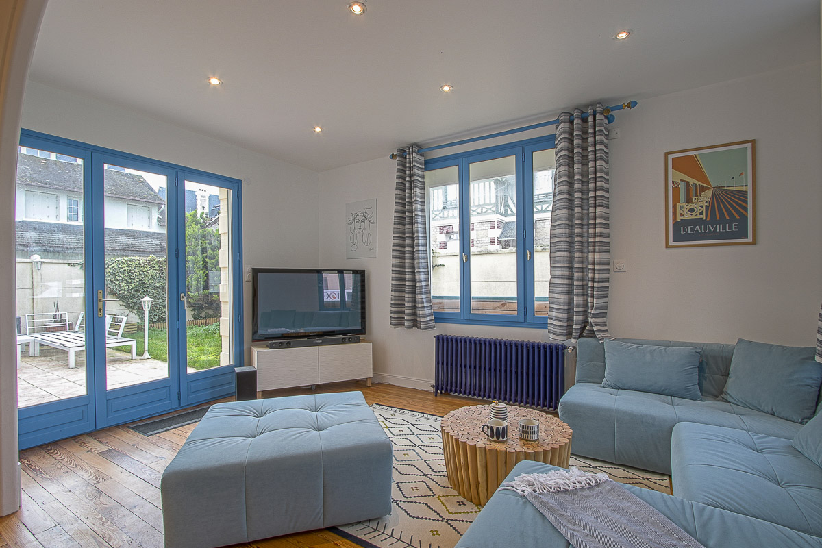 • Un salon convivial avec canapé, table basse, télévision et coin repas pour 6 personnes.